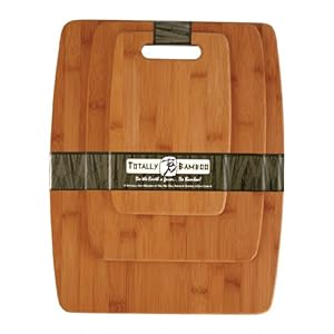 The 3-piece bamboo cutting board set includes three cutting boards. Boards measure 9 by 6 by 3/8-inch, 12 by 8-3/4 by 3/8-inch and 15 by 12 by 3/8-inch. Don't be caught again without an extra cutting board. 3/8 of an inch thick means that these boards are maneuverable and easy to store. Made up of a strong, bamboo. They're also durable; they have a tri-ply, cross laminate construction with a specially formulated high temperature adhesive. Each piece is distinctively attractive, super strong, and totally "green" The benefits of using bamboo are numerous. For example: bamboo is 16-percent harder than maple, it’s naturally anti-microbial and it’s ; it holds the promise of a sustainable, cost effective, and ecologically responsible alternative to the widespread clear cutting of our old growth forests. Totally Bamboo uses organically grown Moso bamboo, so you need not worry about harmful pesticides or fertilizers. Plus, this bamboo is not a food source, or a habitat, for the Giant Panda. Totally good for you and totally good for the environment! Boards are easy to maintain. Wash with warm water and use Totally Bamboo’s Revitalizing Oil, occasionally, to extend the life and keep them looking beautiful.