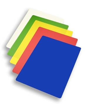 These handy, flexible cutting boards are color coded for different food groups to minimize cross-contamination and to protect countertops. Blue for fish, red for meats, yellow for poultry, green for vegetables and white for general purposes. The flexible boards curl easily to transfer chopped food directly into the bowl, pot or pan..